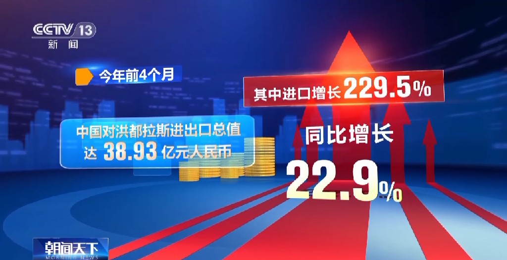 據(jù)統(tǒng)計(jì),今年前4個(gè)月,中國(guó)對(duì)洪都拉斯進(jìn)出口總值達(dá)38.93億元人民幣,同比增長(zhǎng)22.9%,其中進(jìn)口增長(zhǎng)229.5%。(央視新聞客戶端)
