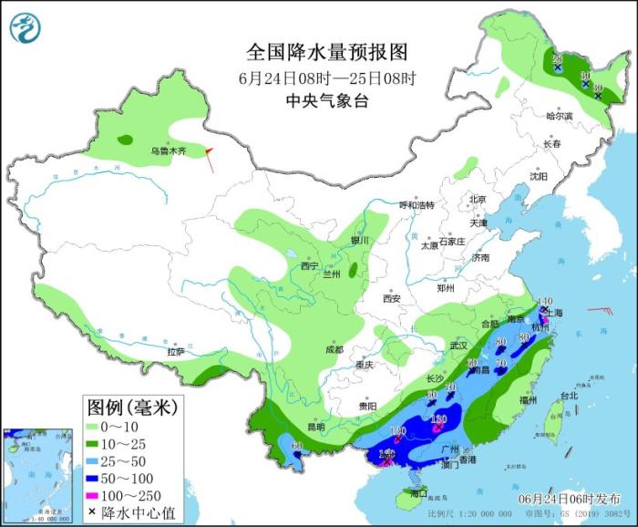 6月24日08時至25日08時,蘇皖南部、上海、浙江北部和西部、福建西北部、江西大部、湖南南部、廣西大部、廣東中西部、云南南部等地部分地區(qū)有大到暴雨,其中,江蘇東南部、上海東部、廣西中部和南部沿海、廣東北部等地局部地區(qū)有大暴雨(100~160毫米)。