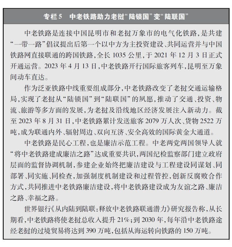 經(jīng)濟走廊和國際通道建設(shè)卓有成效。共建國家共同推進國際骨干通道建設(shè),打造連接亞洲各次區(qū)域以及亞歐非之間的基礎(chǔ)設(shè)施網(wǎng)絡(luò)。中巴經(jīng)濟走廊方向,重點項目穩(wěn)步推進,白沙瓦-卡拉奇高速公路(蘇庫爾至木爾坦段)、喀喇昆侖公路二期(赫韋利揚-塔科特段)、拉合爾軌道交通橙線項目竣工通車,薩希瓦爾、卡西姆港、塔爾、胡布等電站保持安全穩(wěn)定運營,默拉直流輸電項目投入商業(yè)運營,卡洛特水電站并網(wǎng)發(fā)電,拉沙卡伊特別經(jīng)濟區(qū)進入全面建設(shè)階段。新亞歐大陸橋經(jīng)濟走廊方向,匈塞鐵路塞爾維亞貝爾格萊德-諾維薩德段于2022年3月開通運營,匈牙利布達(dá)佩斯-克萊比奧段啟動軌道鋪設(shè)工作;克羅地亞佩列沙茨跨海大橋迎來通車一周年;雙西公路全線貫通;黑山南北高速公路順利建成并投入運營。中國-中南半島經(jīng)濟走廊方向,中老鐵路全線建成通車且運營成效良好,黃金運輸通道作用日益彰顯;作為中印尼共建“一帶一路”的旗艦項目,時速350公里的雅萬高鐵開通運行;中泰鐵路一期(曼谷-呵叻)簽署線上工程合同,土建工程已開工11個標(biāo)段(其中1個標(biāo)段已完工)。中蒙俄經(jīng)濟走廊方向,中俄黑河公路橋、同江鐵路橋通車運營,中俄東線天然氣管道正式通氣,中蒙俄中線鐵路升級改造和發(fā)展可行性研究正式啟動。中國-中亞-西亞經(jīng)濟走廊方向,中吉烏公路運輸線路實現(xiàn)常態(tài)化運行,中國-中亞天然氣管道運行穩(wěn)定,哈薩克斯坦北哈州糧油專線與中歐班列并網(wǎng)運行。孟中印緬經(jīng)濟走廊方向,中緬原油和天然氣管道建成投產(chǎn),中緬鐵路木姐-曼德勒鐵路完成可行性研究,曼德勒-皎漂鐵路啟動可行性研究,中孟友誼大橋、多哈扎里至科克斯巴扎爾鐵路等項目建設(shè)取得積極進展。在非洲,蒙內(nèi)鐵路、亞吉鐵路等先后通車運營,成為拉動?xùn)|非乃至整個非洲國家縱深發(fā)展的重要通道。
