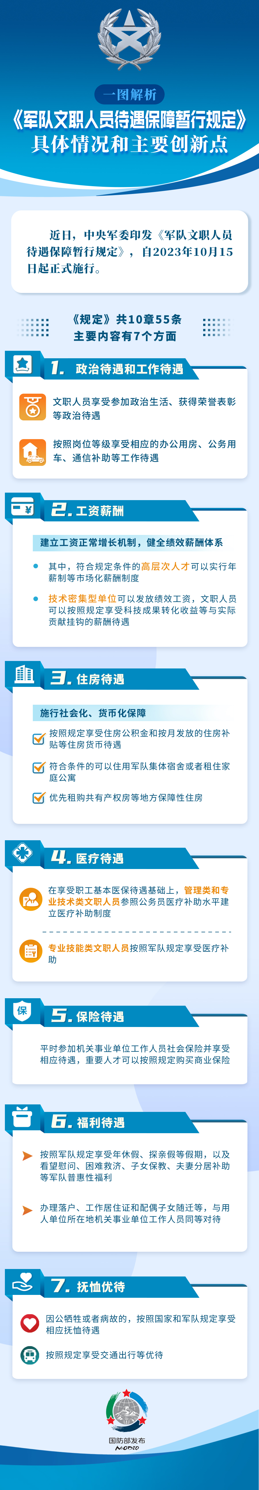 吳謙表示,近日,中央軍委印發(fā)《軍隊文職人員待遇保障暫行規(guī)定》,自2023年10月15日起正式施行?!兑?guī)定》的出臺,將進(jìn)一步提高軍隊文職人員待遇保障,對于延攬社會優(yōu)秀人才獻(xiàn)身強(qiáng)軍事業(yè)、激發(fā)文職人員活力動力、促進(jìn)文職人員隊伍高質(zhì)量發(fā)展,將發(fā)揮重要作用。