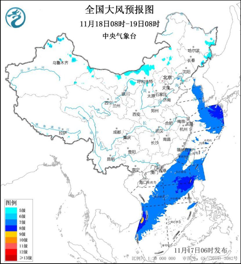 11月17日08時至18日08時,內(nèi)蒙古中東部、東北大部、河北北部、山東半島東部等地將有5~6級、陣風7~8級的大風;渤海、渤海海峽、黃海大部海域、東海大部海域、臺灣海峽、臺灣以東洋面、巴士海峽、南海大部海域將有7~8級、陣風9~10級的大風。11月18日08時至19日08時,內(nèi)蒙古中東部、黑龍江東部、吉林東部等地將有5~6級、陣風7~8級的大風;黃海東部海域、東海東北部海域、臺灣海峽、臺灣以東洋面偏南海域、巴士海峽、南海大部海域將有7~8級、陣風9~10級的大風。中央氣象臺11月17日06時繼續(xù)發(fā)布大風藍色預警。