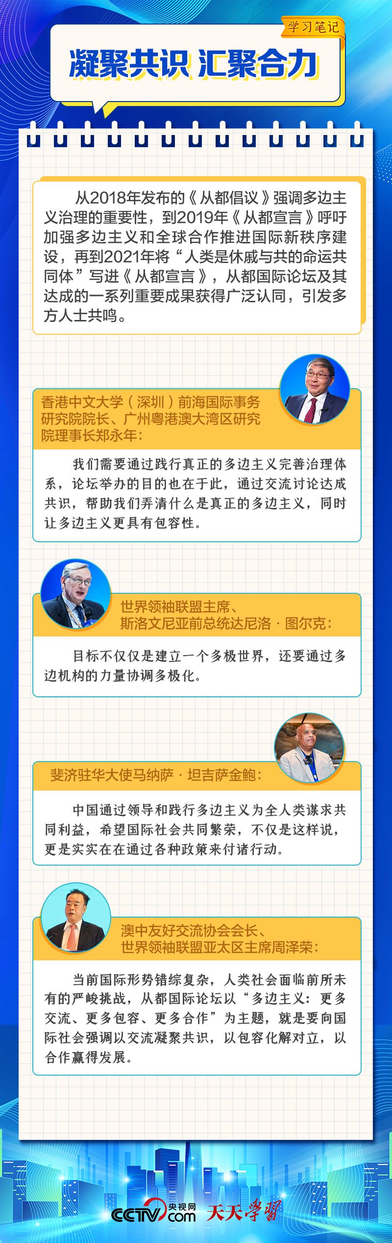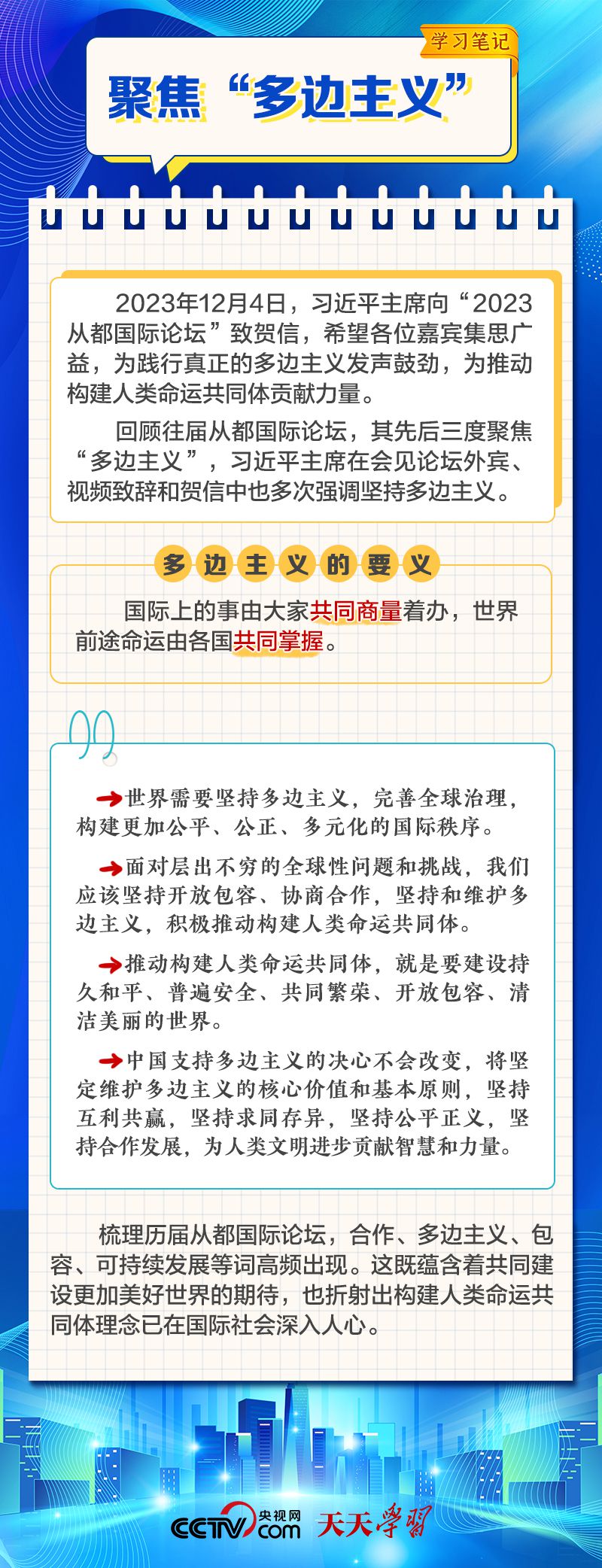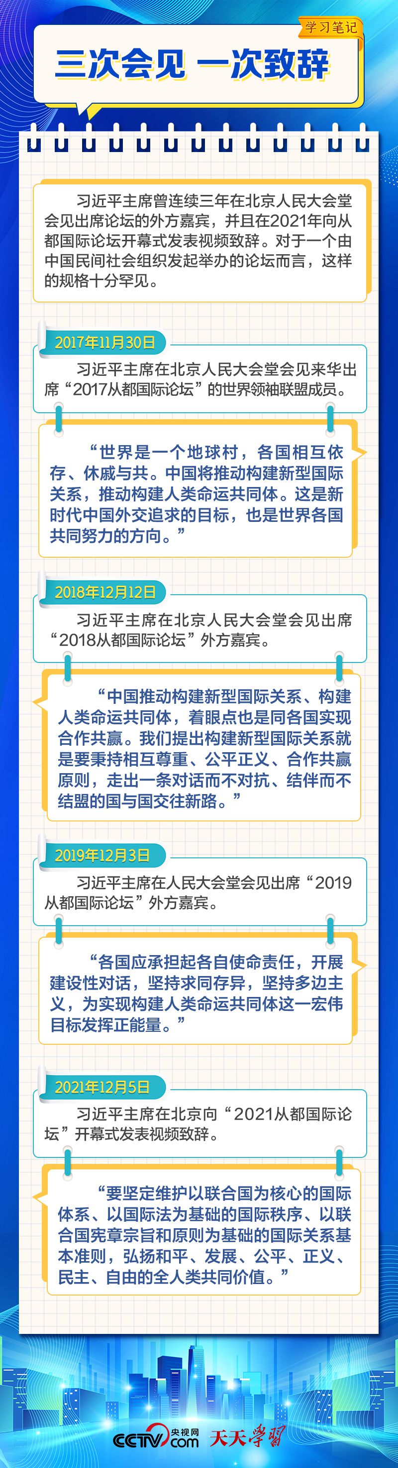 天天學習 12月4日,習近平主席在致“2023從都國際論壇”的賀信中強調,面對前所未有的世界之變、時代之變和歷史之變,人類社會必須團結起來,堅持互學互鑒、開放包容、合作共贏,弘揚全人類共同價值,共同建設更加美好的世界。