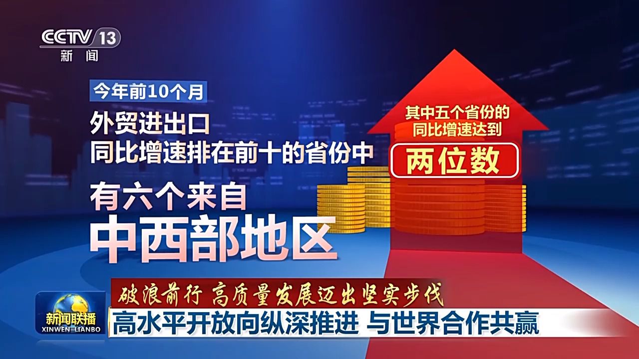 高水平開放,也讓曾經(jīng)的開放“末梢”變成“前沿”。最新數(shù)據(jù)顯示,今年前10個(gè)月,外貿(mào)進(jìn)出口同比增速排在前十的省份中,有六個(gè)來(lái)自中西部地區(qū)。其中五個(gè)省份的同比增速達(dá)到兩位數(shù)。
