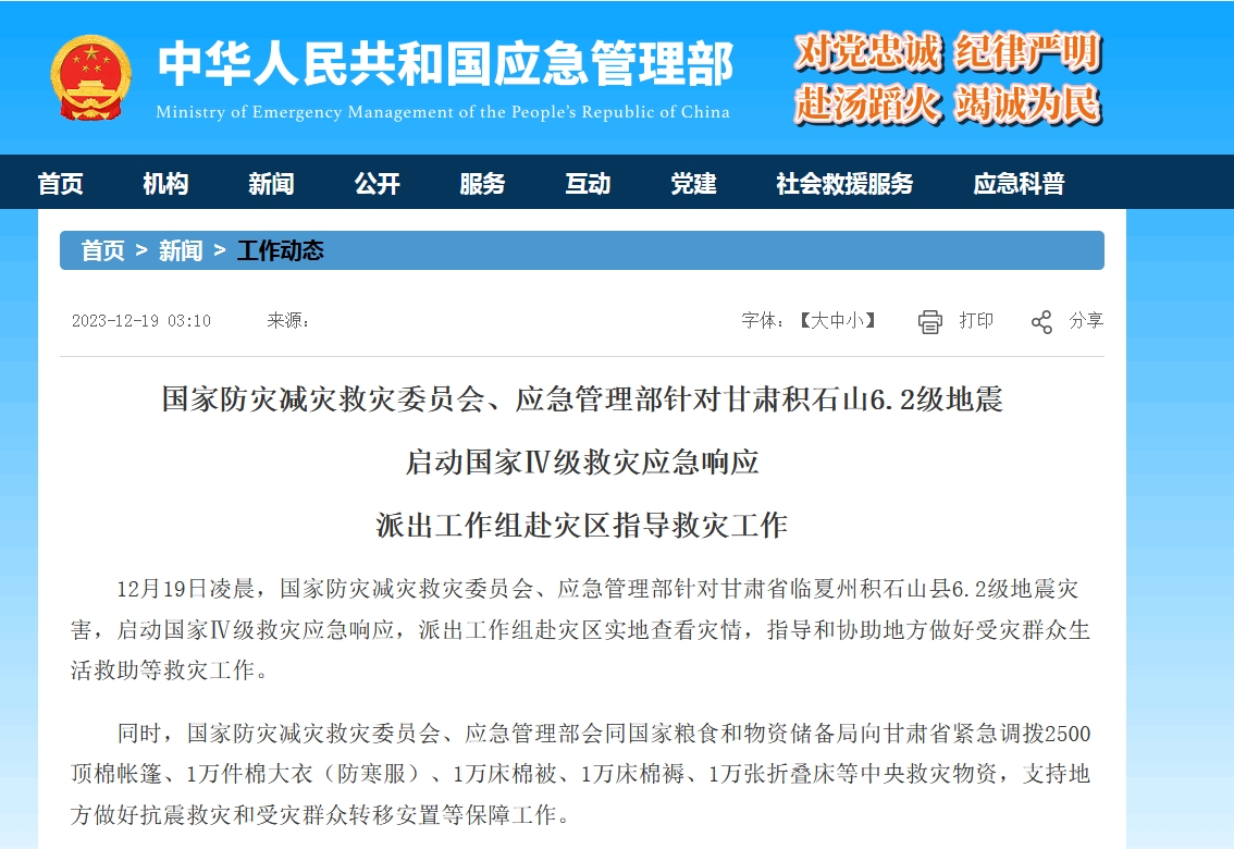 中新網(wǎng)12月19日電 據(jù)應(yīng)急管理部網(wǎng)站消息,12月19日凌晨,國家防災(zāi)減災(zāi)救災(zāi)委員會、應(yīng)急管理部針對甘肅省臨夏州積石山縣6.2級地震災(zāi)害,啟動國家Ⅳ級救災(zāi)應(yīng)急響應(yīng),派出工作組赴災(zāi)區(qū)實地查看災(zāi)情,指導(dǎo)和協(xié)助地方做好受災(zāi)群眾生活救助等救災(zāi)工作。