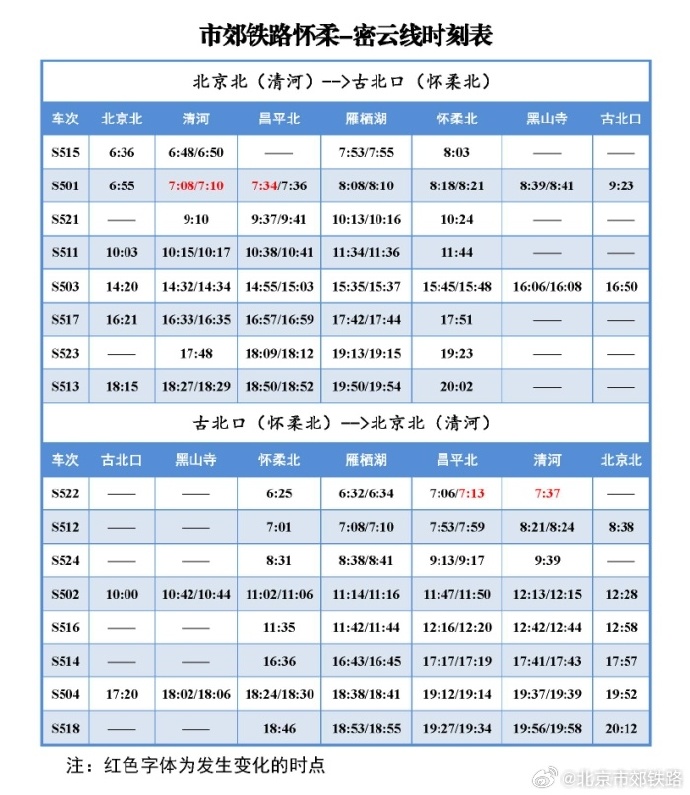 中新網(wǎng)1月9日電 據(jù)北京市郊鐵路官方微博消息,2024年1月10日起,北京市郊鐵路懷柔-密云線列車(chē)開(kāi)行時(shí)點(diǎn)調(diào)整,具體列車(chē)時(shí)刻表如下圖所示: