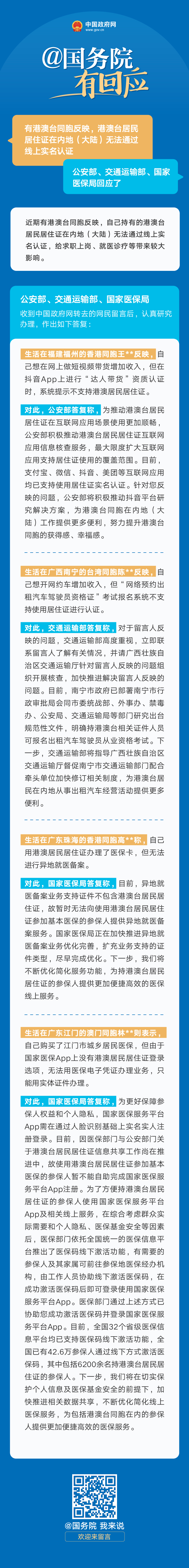公安部、交通運輸部、國家醫(yī)保局答網(wǎng)民關(guān)于“加快推進港澳臺居民居住證線上實名認證”的留言