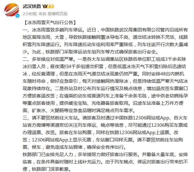 武漢鐵路:冰凍雨雪致多趟列車(chē)停運(yùn),不要貿(mào)然前往火車(chē)站