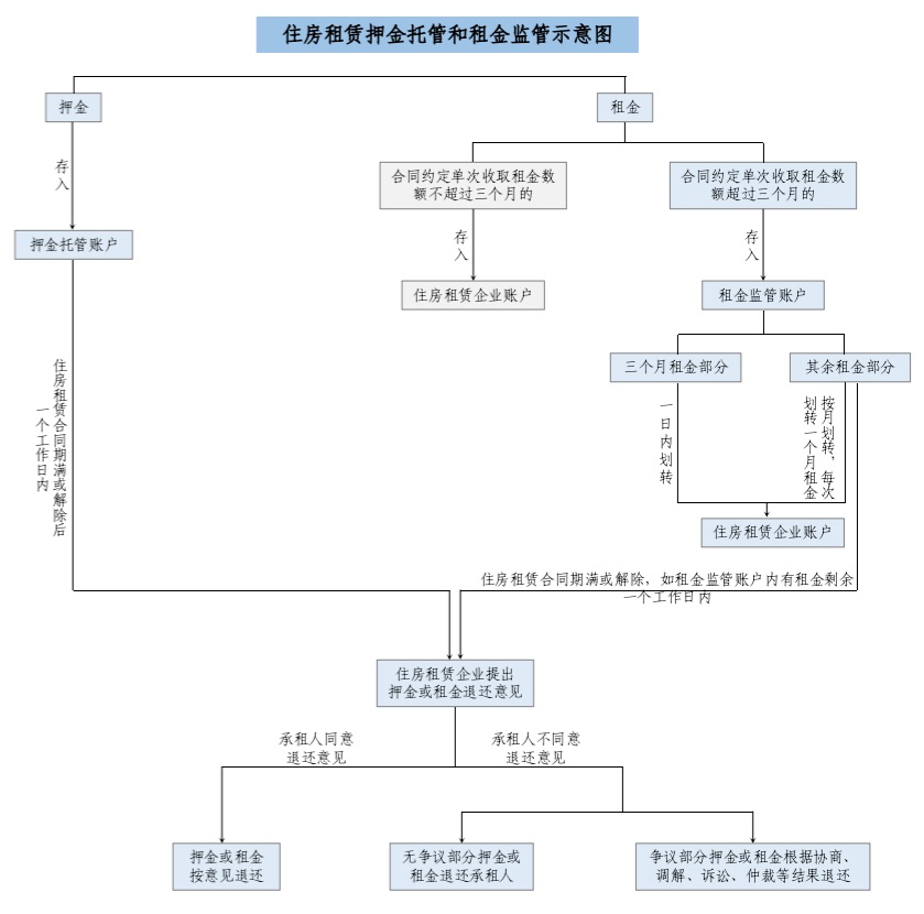 《征求意見(jiàn)稿》規(guī)定,押金按照住房租賃合同約定的時(shí)間、金額存入押金托管賬戶,租金方面,單次收取租金數(shù)額超過(guò)三個(gè)月的,租金按照合同約定時(shí)間、金額存入租金監(jiān)管賬戶。其中三個(gè)月租金部分在一日內(nèi)劃轉(zhuǎn)至住房租賃企業(yè)賬戶,其余租金按月劃轉(zhuǎn),每次劃轉(zhuǎn)金額為一個(gè)月租金。
