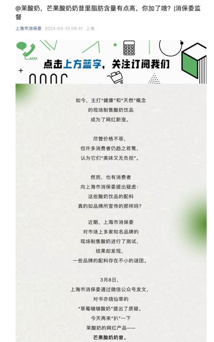 上海市消保委點名茉酸奶 質疑芒果酸奶奶昔成分