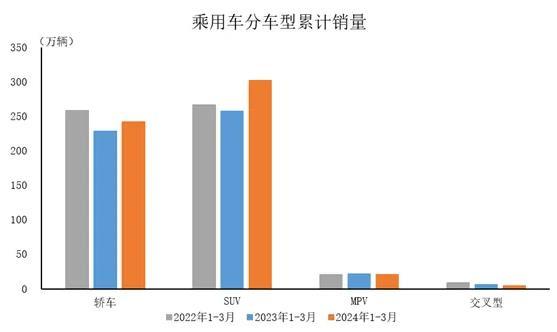 2024年1-3月,在乘用車主要品種中,與上年同期相比,運動型多用途乘用車(SUV)產(chǎn)銷呈兩位數(shù)增長,基本型乘用車(轎車)產(chǎn)銷小幅增長,多功能乘用車(MPV)和交叉型乘用車產(chǎn)銷呈不同程度下降。