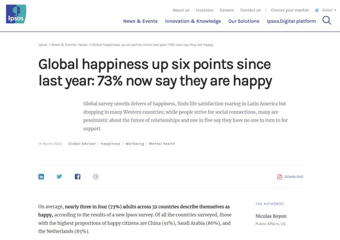 調查結果顯示,平均而言,在32個國家中,近四分之三(73%)的成年人認為自己很幸福。在所有接受調查的國家中,幸福感指數最高的國家是中國(91%),其后是沙特阿拉伯(86%)、荷蘭(85%)、印度(84%)、巴西(83%)。
