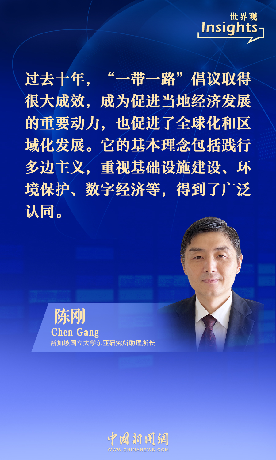 陳剛舉例說(shuō),過(guò)去十年,“一帶一路”倡議取得很大成效,成為沿線國(guó)家經(jīng)濟(jì)發(fā)展的重要?jiǎng)恿?,也促進(jìn)了全球化和區(qū)域化發(fā)展。它的基本理念包括踐行多邊主義,重視基礎(chǔ)設(shè)施建設(shè)、環(huán)境保護(hù)、數(shù)字經(jīng)濟(jì)等。這一倡議,在世界范圍內(nèi)得到了廣泛認(rèn)同。