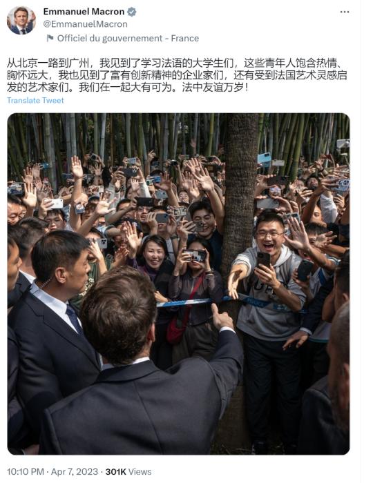 馬克龍寫道,“從北京一路到廣州,我見到了學(xué)習(xí)法語的大學(xué)生們,這些青年人飽含熱情、胸懷遠大,我也見到了富有創(chuàng)新精神的企業(yè)家們,還有受到法國藝術(shù)靈感啟發(fā)的藝術(shù)家們。我們在一起大有可為。法中友誼萬歲!”