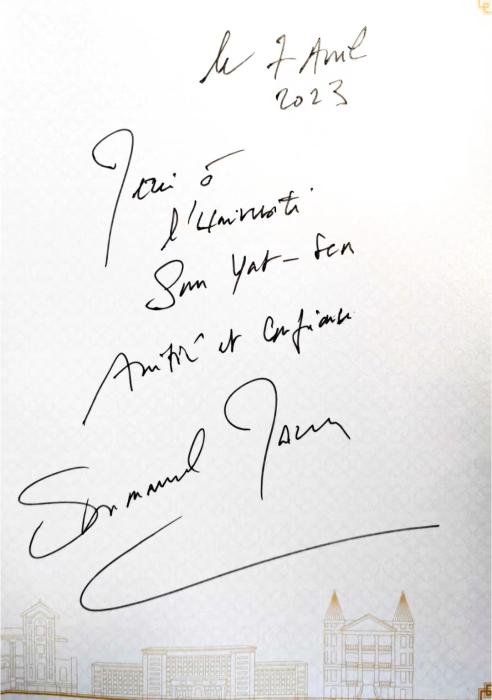 臨別之時,馬克龍留下感言,為中山大學(xué)題字:“感謝中山大學(xué)的友誼與信任。埃馬紐埃爾·馬克龍,2023年4月7日。”