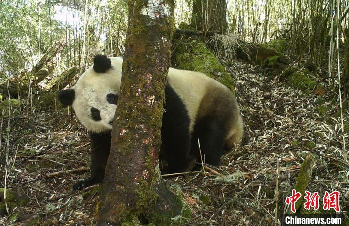 野生大熊貓“磨皮擦癢”。 大熊貓國家公園石棉片區(qū) 供圖