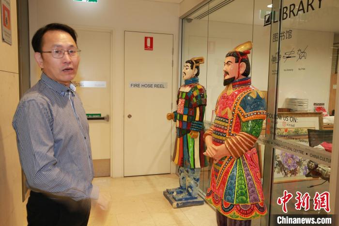 圖為悉尼中國(guó)文化中心內(nèi)彩色兵馬俑藝術(shù)展品?!≈行律缬浾?顧時(shí)宏 攝