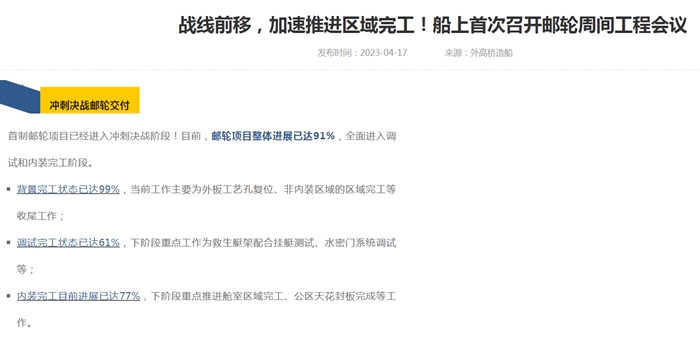外高橋造船公布首艘國產大郵輪最新進展情況。外高橋造船網站截圖