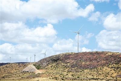 在南非北開普省德阿鎮(zhèn),中國龍源電力集團(tuán)南非公司運營的德阿風(fēng)電項目風(fēng)機(jī)。