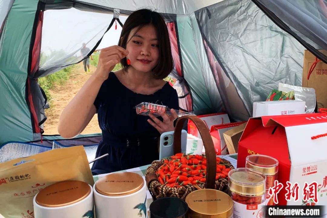 圖片枸杞鮮果成熟時(shí),主播在田間地頭進(jìn)行直播帶貨。李佩珊 攝
