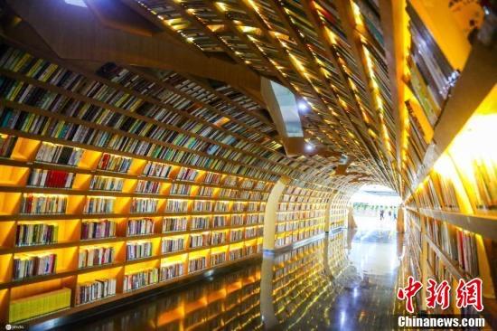 資料圖:河南省鄭州市,一所高校在圖書館內打造了一條近百米長的“書海隧道”。