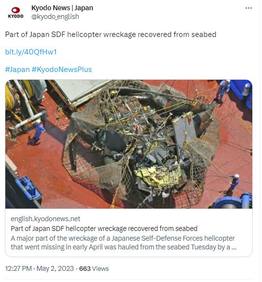 據(jù)報道,潛水員此前在伊良部島以北6公里海域106米深處,發(fā)現(xiàn)了失聯(lián)直升機主體部分。5月2日,該部分被打撈網(wǎng)撈出水面。