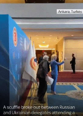 中新網(wǎng)5月5月電 綜合外媒報(bào)道,當(dāng)?shù)貢r(shí)間4日,在土耳其安卡拉舉行的黑海經(jīng)濟(jì)合作組織議會(huì)大會(huì)(PABSEC)會(huì)議間隙,俄烏代表團(tuán)成員因?yàn)橐幻鏋蹩颂m國(guó)旗扭打在了一起。