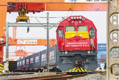 中歐班列是中法進(jìn)出口貿(mào)易的重要橋梁。圖為4月26日,為紀(jì)念成都國際班列十周年而開行的“法國郵政DPD專列”在四川省成都市青白江區(qū)國際鐵路港首發(fā)。
