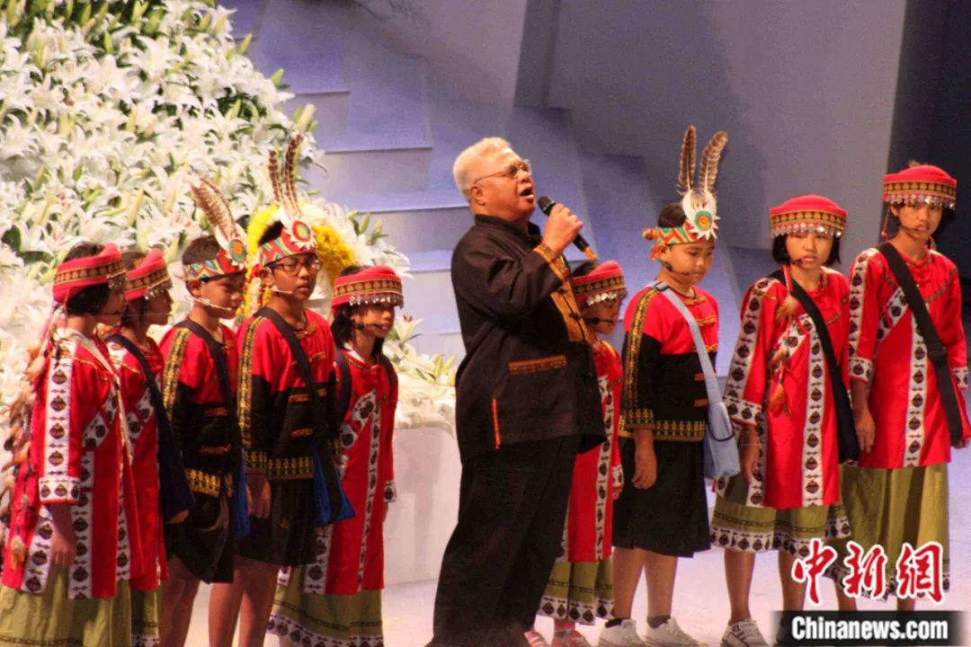 2009年9月,“88水災”追悼大會在高雄市巨蛋舉行,約5000人與會。圖為臺灣著名歌手胡德夫帶領(lǐng)九個孩子出場,演唱歌曲悼念逝者,為受災民眾祈福。董會峰 攝