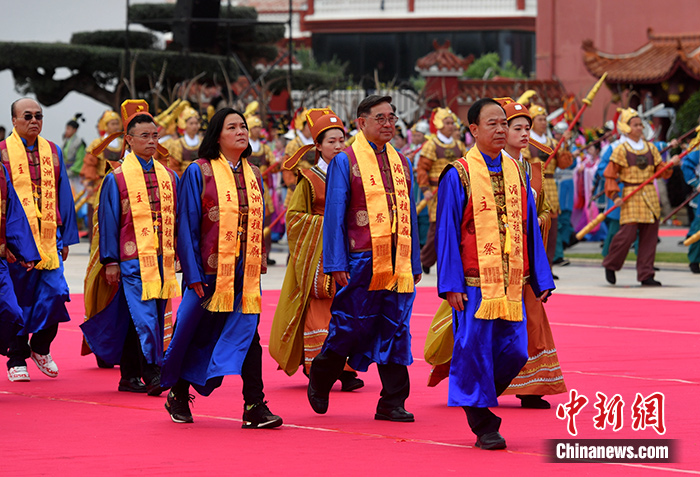 圖為5月12日,吳成典(右二)在福建湄洲島參加癸卯年紀(jì)念媽祖誕辰1063周年大會暨春祭大典活動。 中新社記者 呂明 攝