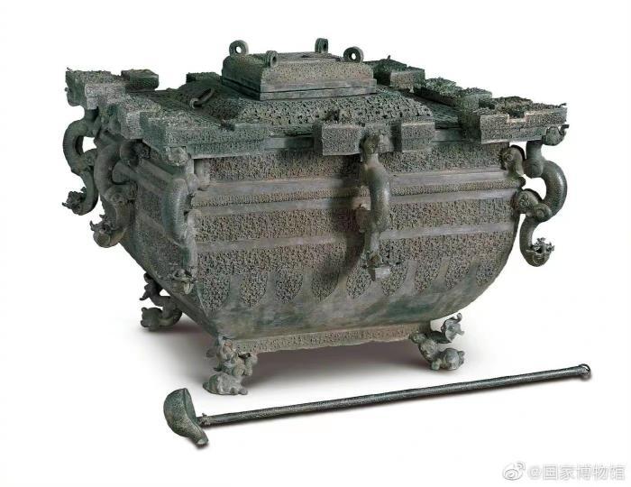 比如人們熟悉的“青銅冰鑒”,它是由一個方鑒和一件方尊缶組成的青銅套器,與之配套的還有一把長柄青銅勺。從造型上看,該青銅冰鑒結構精巧,體態(tài)厚重。