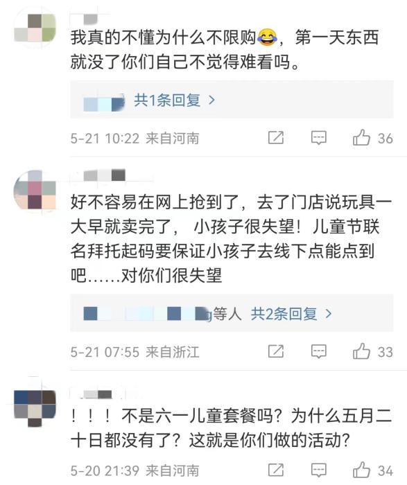 但自5月20日起,在社交平臺上,就不斷有人反映,已經(jīng)買不到肯德基兒童節(jié)限定玩具??系禄墓俜轿⒉┫拢灿泻芏嗳肆粞?,門店已售罄,能不能補(bǔ)貨。