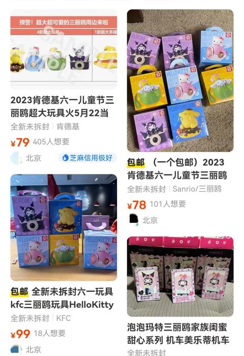 在某二手平臺,肯德基此次發(fā)售的三麗鷗玩具,標(biāo)價(jià)集中在70元至100元之間,比69.9元的兒童節(jié)套餐價(jià)格更貴。麥當(dāng)勞俄羅斯方塊游戲機(jī)的價(jià)格多在40元至60元之間。
