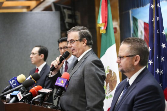2019年8月5日,在美國(guó)得克薩斯州埃爾帕索的墨西哥駐埃爾帕索領(lǐng)事館,墨西哥外長(zhǎng)埃布拉德(左三)在記者會(huì)上講話。新華社記者王迎攝