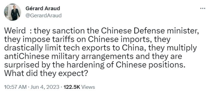 中新網6月5日電 日前,法國前駐美大使熱拉爾·阿羅在推特上提出一個值得思考的問題,“奇怪,他們(美國)制裁中國國防部長,他們對中國進口商品征收關稅,他們大幅限制對華技術出口……現在他們反而對中國立場的強硬感到驚訝。美國到底想要什么?”
