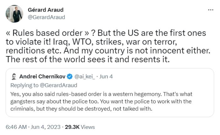 在另一條推文中,阿羅指出,從美國在伊拉克戰(zhàn)爭、世貿組織違規(guī)、所謂“反恐戰(zhàn)爭”中的表現可見,是美國首先違反了“基于規(guī)則的秩序”。世界上其他國家看到了這一點,對此感到憤慨。