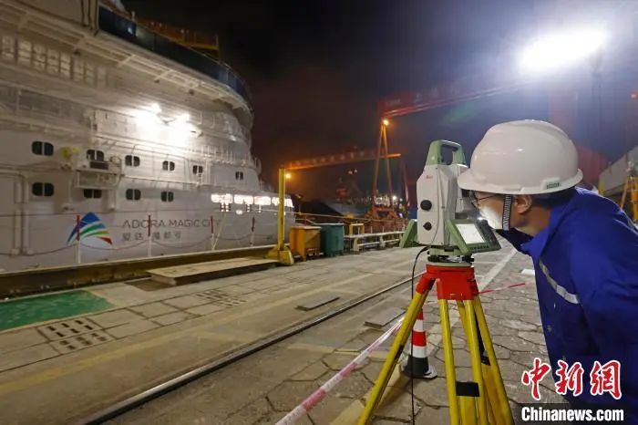 6月1日凌晨2時(shí),中國(guó)首艘國(guó)產(chǎn)大型郵輪“愛(ài)達(dá)·魔都號(hào)”開始注水起浮,工作人員對(duì)船體相關(guān)數(shù)據(jù)進(jìn)行檢測(cè)。殷立勤 攝