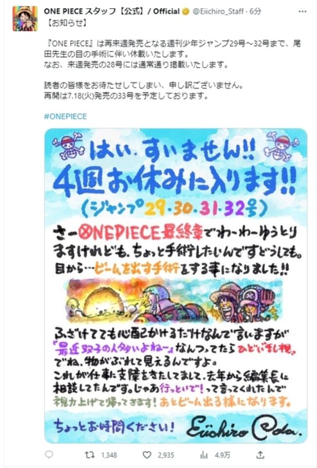 其官網(wǎng)還發(fā)布了尾田榮一郎在自己的手繪插畫上寫的“請假條”。他表示:“非常抱歉,我將休息四周時(shí)間。《航海王》雖然已經(jīng)進(jìn)入終章,但由于眼睛的散光很嚴(yán)重,看東西時(shí)出現(xiàn)重影,所以需要做個手術(shù)。請給我一些時(shí)間(修養(yǎng)一下)?!?/p>