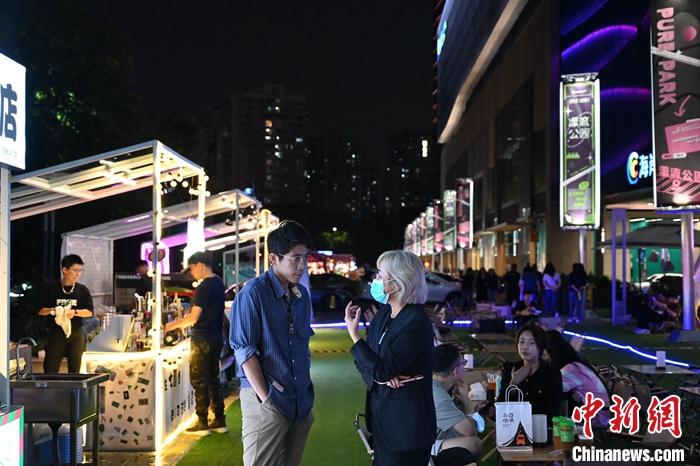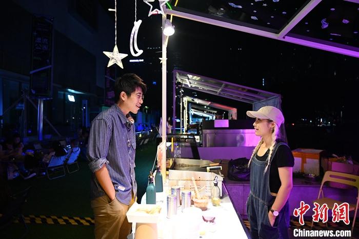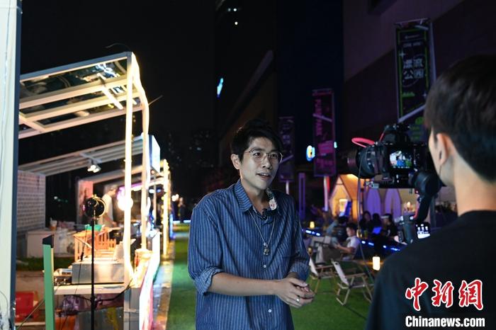 夜幕下的深圳市南山區(qū)人潮涌動,一處集合了美食、潮流、游戲等元素的市集內(nèi),臺灣青年周伯彥正與幾位工作人員一起檢查場地布置和物料擺放,為市集營業(yè)做最后的準備。