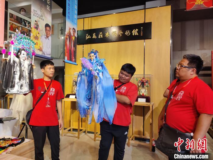 6月17日,在廈門舉行的海峽兩岸布袋木偶戲藝術(shù)節(jié)上,王英峻(右一)與兩位“00后”徒弟一起表演金光布袋木偶戲?!≈行律缬浾?葉秋云 攝