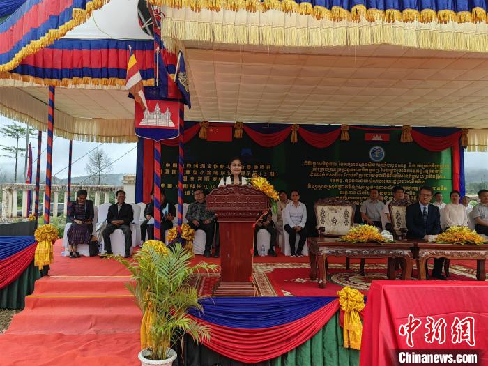 當?shù)貢r間6月18日,“瀾湄國家典型小流域綜合治理示范(三期)”項目俄勒塞村成果移交儀式在柬埔寨國公省莫邦縣舉行。圖為中國駐柬埔寨大使館公使銜參贊趙海燕致辭。 中新社記者 楊強 攝