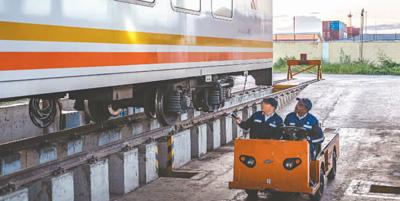 在肯尼亞內(nèi)羅畢,吳同明(左)與學員基魯姆瓦在車輛運用車間檢查客運車廂。2017年來到肯尼亞的中國師父吳同明是非洲之星鐵路運營公司機輛部車間工程師?!皩W員的積極主動讓我印象深刻?!眳峭髡f?;斈吠哒f:“未來希望更多的中國老師來到肯尼亞,與我們一同推動基礎設施建設?!?/p>