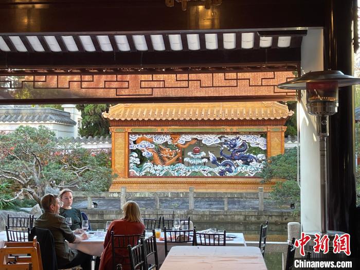 7月1日,游客在誼園“騰龍戲珠”琉璃壁前中餐廳休憩。 羅文俊 攝