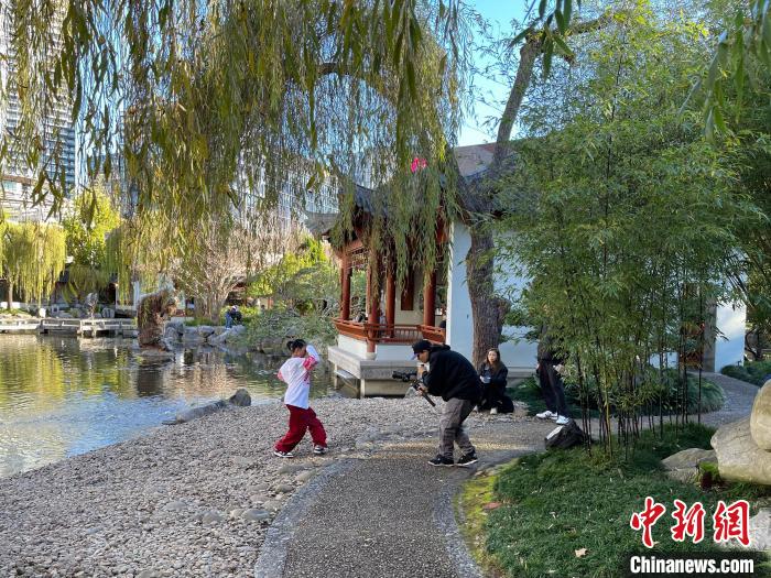 在湖邊,中國戲曲元素結(jié)合英文說唱的音樂吸引了游客們駐足。在悉尼從事汽修工作十余年的華人楊女士帶著兒子艾迪在湖邊拍攝音樂短視頻。穿著印有紅色京劇臉譜衛(wèi)衣的艾迪伴著動感音樂起舞?!拔曳浅O矚g這里中西結(jié)合的感覺。希望在公共場合拍攝能培養(yǎng)孩子的自信心。”楊女士說。