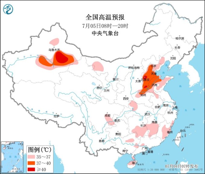 高溫方面,受降雨影響華北大部高溫天氣得到短暫緩解,明天起(5日)京津冀及黃淮等地高溫將再度發(fā)展加強(qiáng),河北大部、北京、天津、山東北部、河南中北部等地日最高氣溫可達(dá)37~39℃,部分地區(qū)超過40℃。請(qǐng)公眾注意做好防曬降溫措施,盡量減少外出和戶外活動(dòng)時(shí)間,及時(shí)補(bǔ)充水分,警惕高溫引發(fā)的中暑。