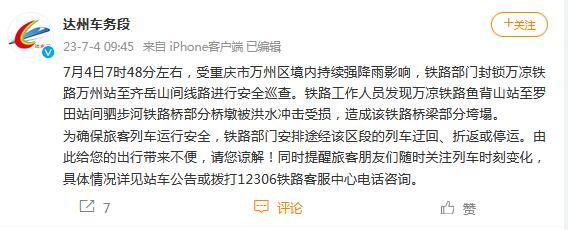 中新網(wǎng)7月4日電 據(jù)成都鐵路局達(dá)州車(chē)務(wù)段官方微博消息,7月4日7時(shí)48分左右,受重慶市萬(wàn)州區(qū)境內(nèi)持續(xù)強(qiáng)降雨影響,鐵路部門(mén)封鎖萬(wàn)涼鐵路萬(wàn)州站至齊岳山間線路進(jìn)行安全巡查。鐵路工作人員發(fā)現(xiàn)萬(wàn)涼鐵路魚(yú)背山站至羅田站間駟步河鐵路橋部分橋墩被洪水沖擊受損,造成該鐵路橋梁部分垮塌。為確保旅客列車(chē)運(yùn)行安全,鐵路部門(mén)安排途經(jīng)該區(qū)段的列車(chē)迂回、折返或停運(yùn)。