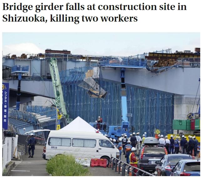 報道稱,當(dāng)時約20名施工人員在靜岡市國道1號上進行夜間高架橋搭建作業(yè)。長約65米、重約140噸的高架橋鋼架突然折斷,并從約九米高處墜地。當(dāng)局稱,施工人員當(dāng)時正在調(diào)整鋼架的水平方向。