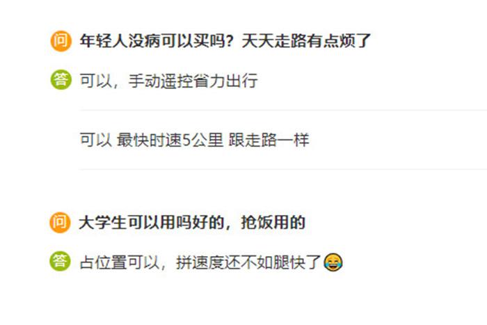 中新財(cái)經(jīng)注意到,在電商平臺(tái)上電動(dòng)輪椅的問答區(qū),不少消費(fèi)者都對(duì)電動(dòng)輪椅展現(xiàn)出了濃厚的興趣,“年輕人沒病可以買嗎?天天走路有點(diǎn)煩了?!薄按髮W(xué)生可以用嗎?”“食堂搶飯用!神器?!薄澳贻p人也可以用,省力出行?!?/p>