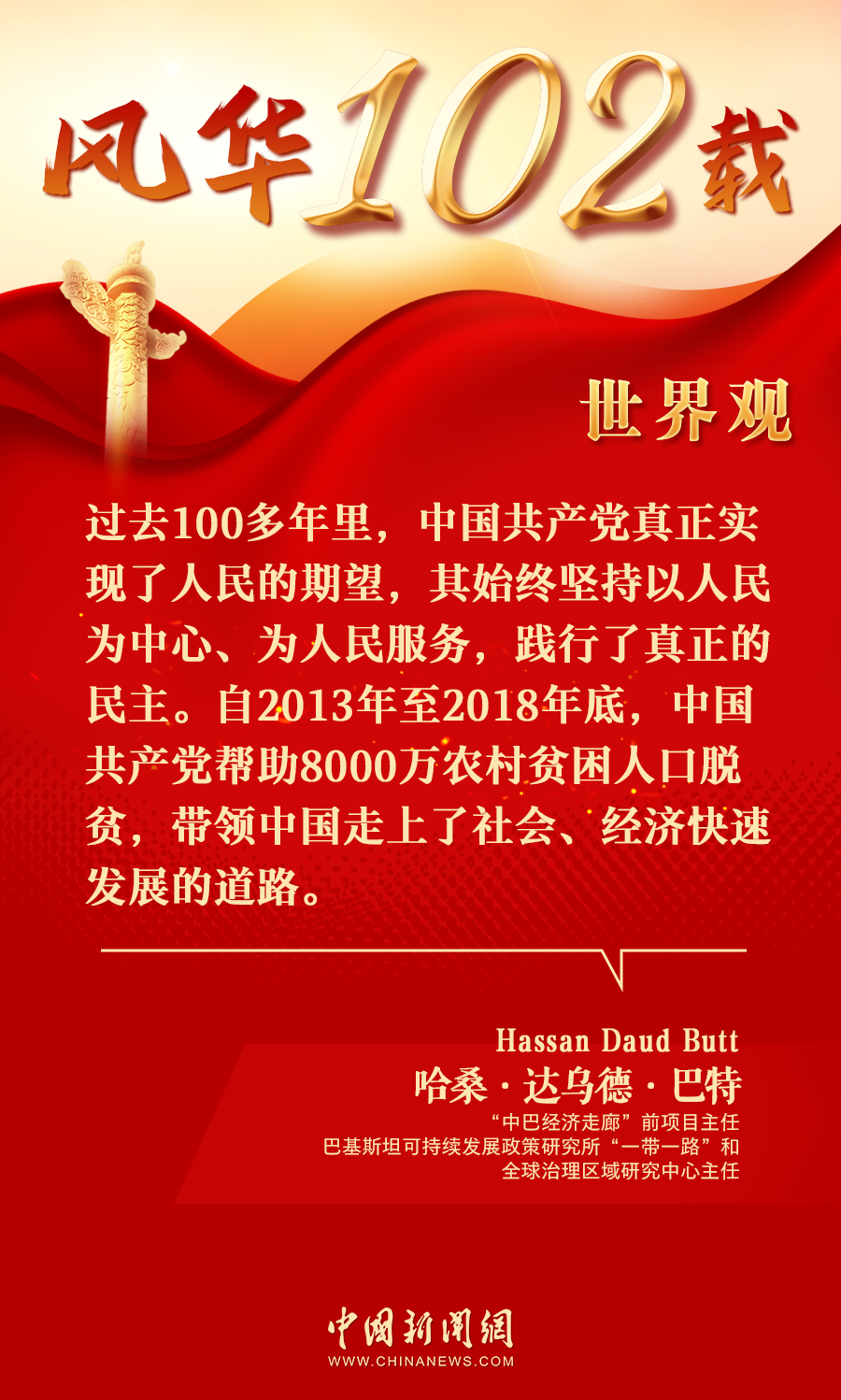 中新網(wǎng)7月8日電(陳彩霞)日前,投資領(lǐng)域?qū)<?,“中巴?jīng)濟走廊”前項目主任、巴基斯坦可持續(xù)發(fā)展政策研究所“一帶一路”和全球治理區(qū)域研究中心主任哈?!み_烏德·巴特(Hassan Daud Butt)在接受中新網(wǎng)專訪時表示,過去100多年里,中國共產(chǎn)黨真正實現(xiàn)了人民的期望,其始終堅持以人民為中心、為人民服務,帶領(lǐng)中國走上了社會、經(jīng)濟快速發(fā)展的道路。