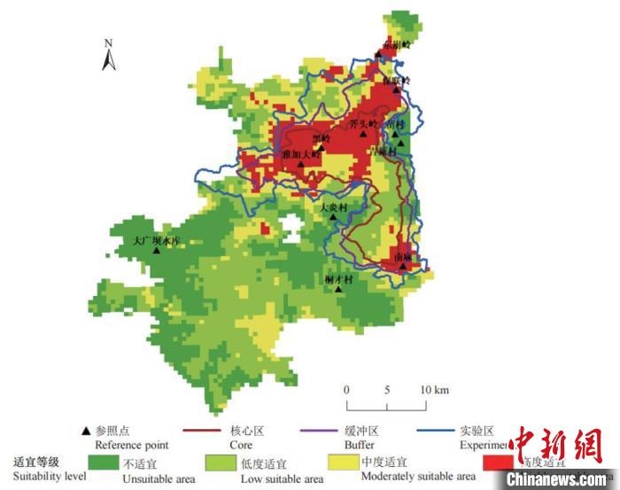 圖為科學家繪制出的海南霸王嶺一帶適合海南長臂猿棲息的區(qū)位圖。(許涵供圖)