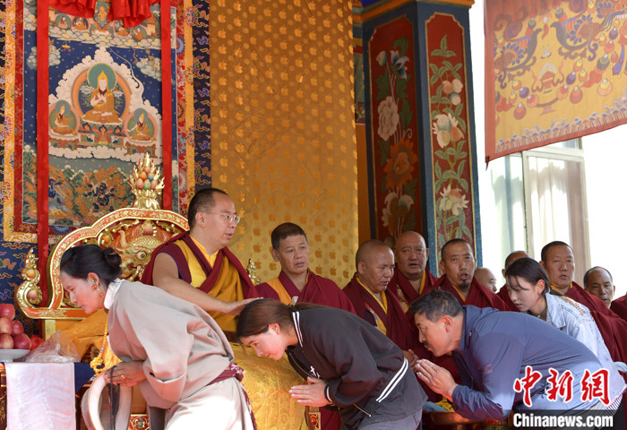 7月17日,班禪在雪林多吉頗章為信眾系上哈達。 中新社記者李林 攝